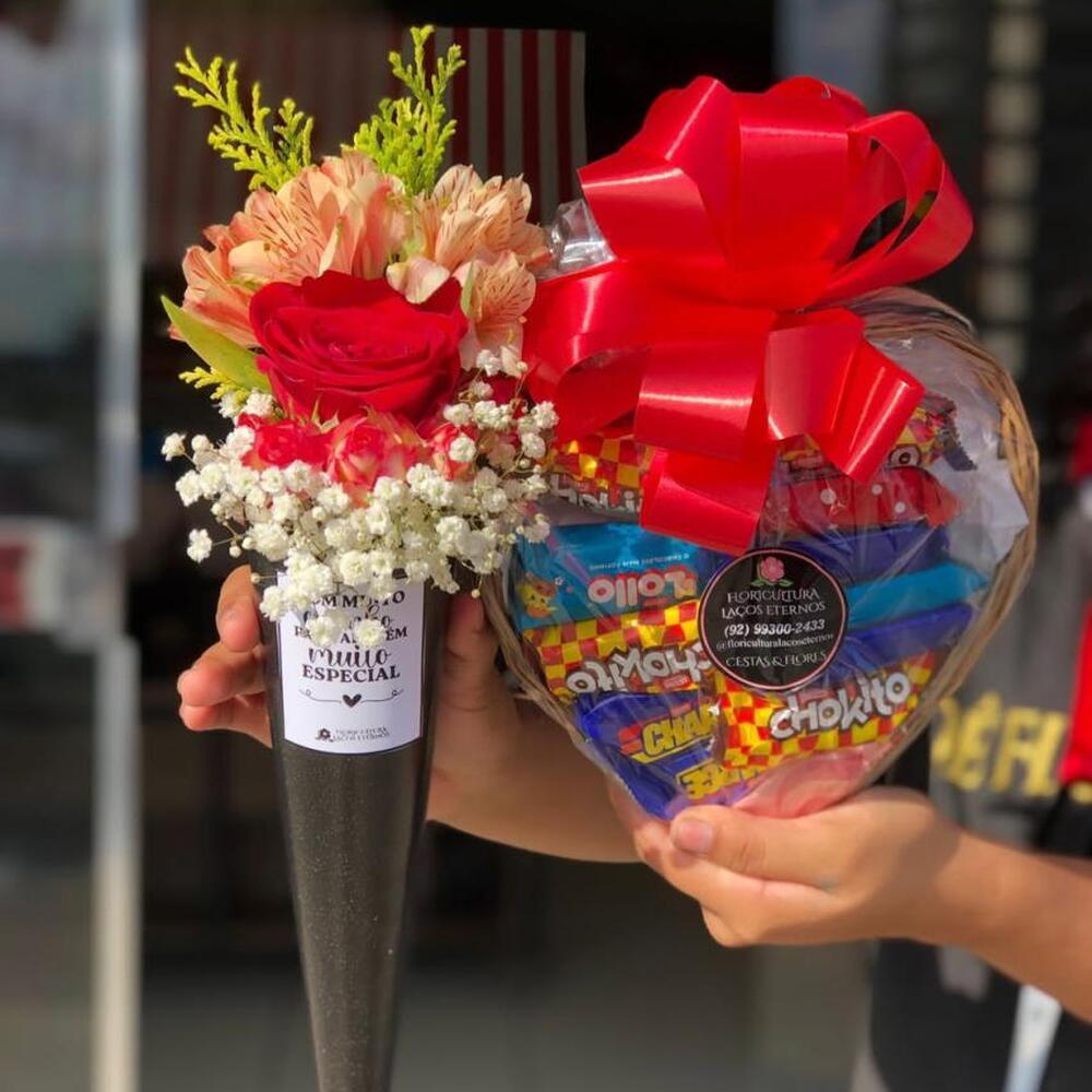 Carinho e Sabor em Cada Detalhe Surpreenda com este cone de flores encantador, montado com uma rosa grande, 3 mini rosas, astromélias e Gypsophila (mosquitinho), criando uma combinação única de suavidade e beleza. Acompanhado por uma cesta de chocolates deliciosos, este presente une elegância e sabor em um gesto de carinho. Acompanha também um cartão personalizado, para que você possa expressar sua mensagem de forma especial e inesquecível.