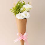 folhagens verdes - 1 un. cone kraft - 1 un. laço fácil - 1 un. folhagens tango - 1 un. trigos - 2 un. lisianthus branco (flores) - 4 un.