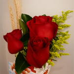 folhagens verdes - 1 un. rosa vermelhas nacionais - 3 un. laço fácil - 1 un. folhagens tango - 1 un. trigos - 2 un. cone coração - 1 un.