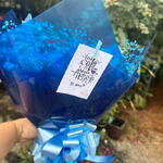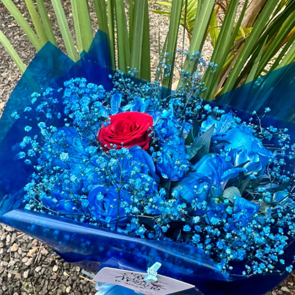 rosa - 1 un. laço - 1 un. mosquitinhos azuis - 1 un. astromelias azuis - 1 un. embalagem moderna - 1 un.