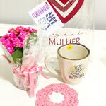 mini kalachoe - 1 un. sacola transparente personalizada “ dia da mulher” - 1 un. caneca coleção “essência” - 1 un. porta caneca crochê flor - 1 un.