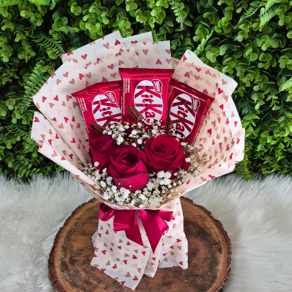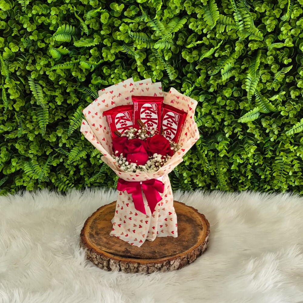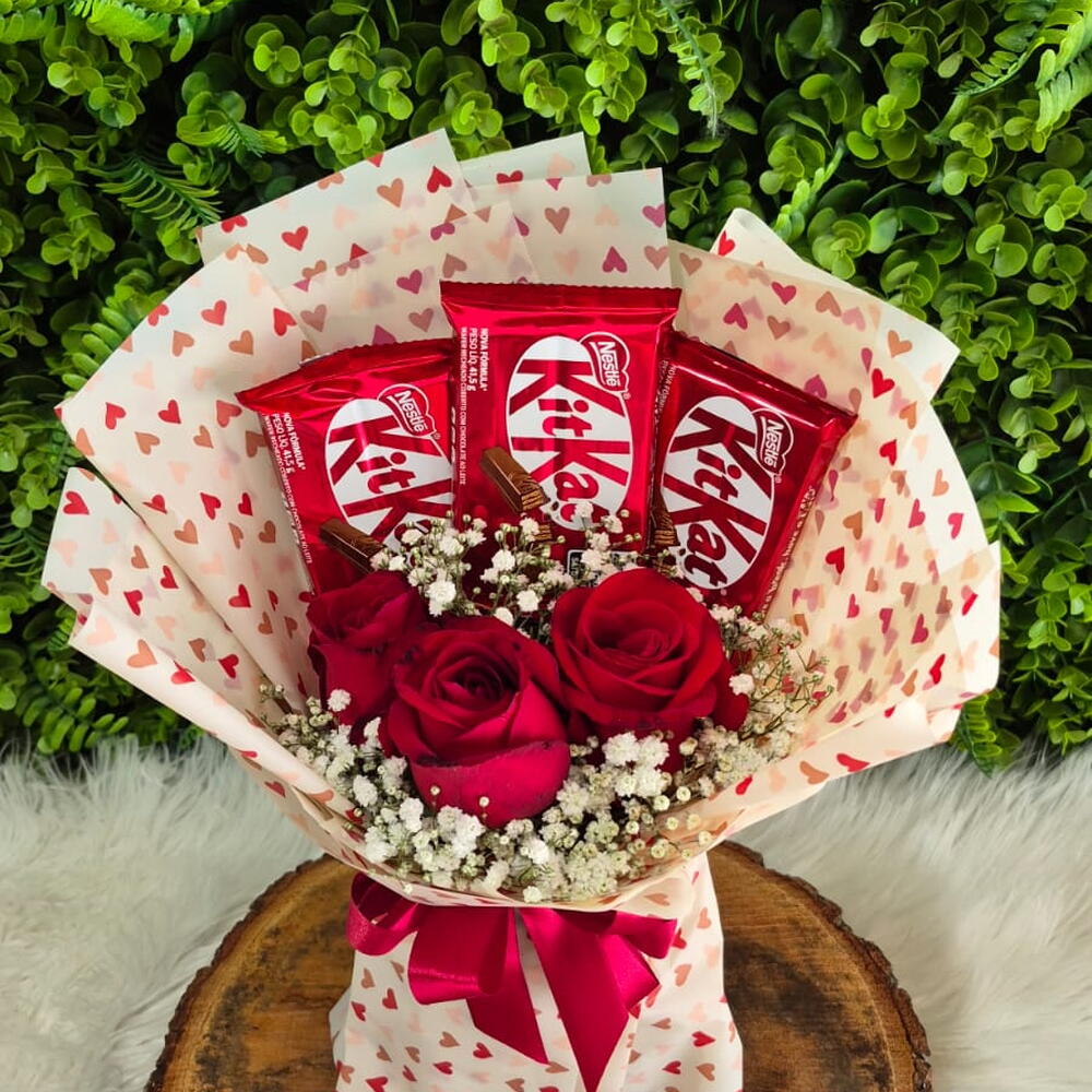 Encante e surpreenda com esse mimo apaixonante 💖 Nosso delicado buquê é composto por 3 rosas vermelhas, símbolo do amor e da paixão, acompanhadas por gypsophila (mosquitinho) que traz leveza e romantismo à composição. Para deixar o presente ainda mais especial, ele vem com 3 chocolates KitKat, tornando a experiência ainda mais doce e inesquecível. Embalado com papel decorado e finalizado com laço em cetim, é a escolha perfeita para presentear em aniversários, Dia dos Namorados, pedidos especiais ou simplesmente para dizer “eu te amo”. Um presente delicado, elegante e cheio de significado
