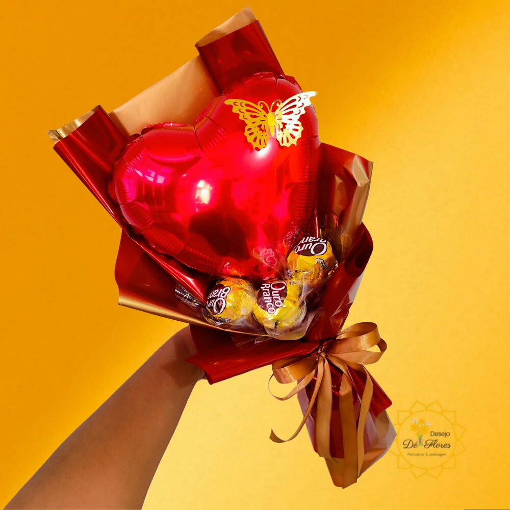 laço cetim - 1 un. embalagem especial - 1 un. bombons ouro branco ou sonho de valsa - 3 un. balao metalizado - 1 un. borboleta dourada - 1 un.