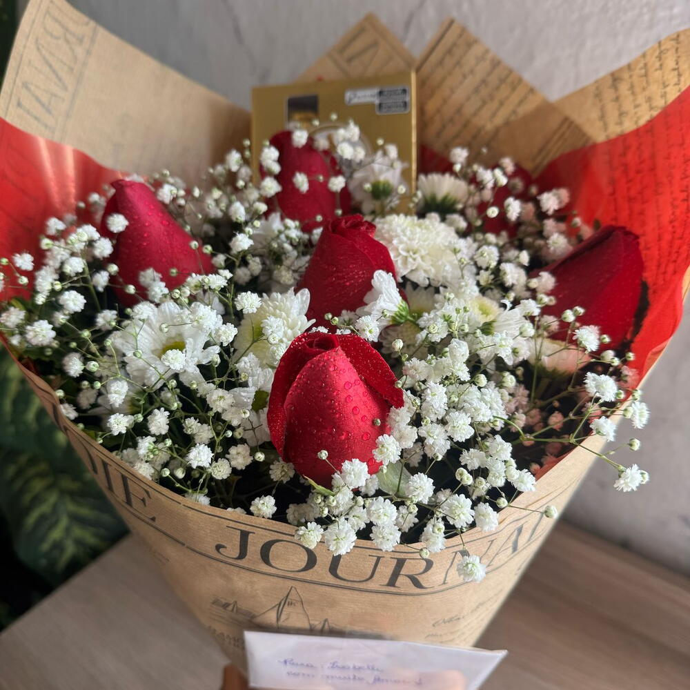 rosa - 6 un. embalagem - 1 un. folhagens - 1 un. laço - 1 un. caixa ferrero rocher - 1 un.