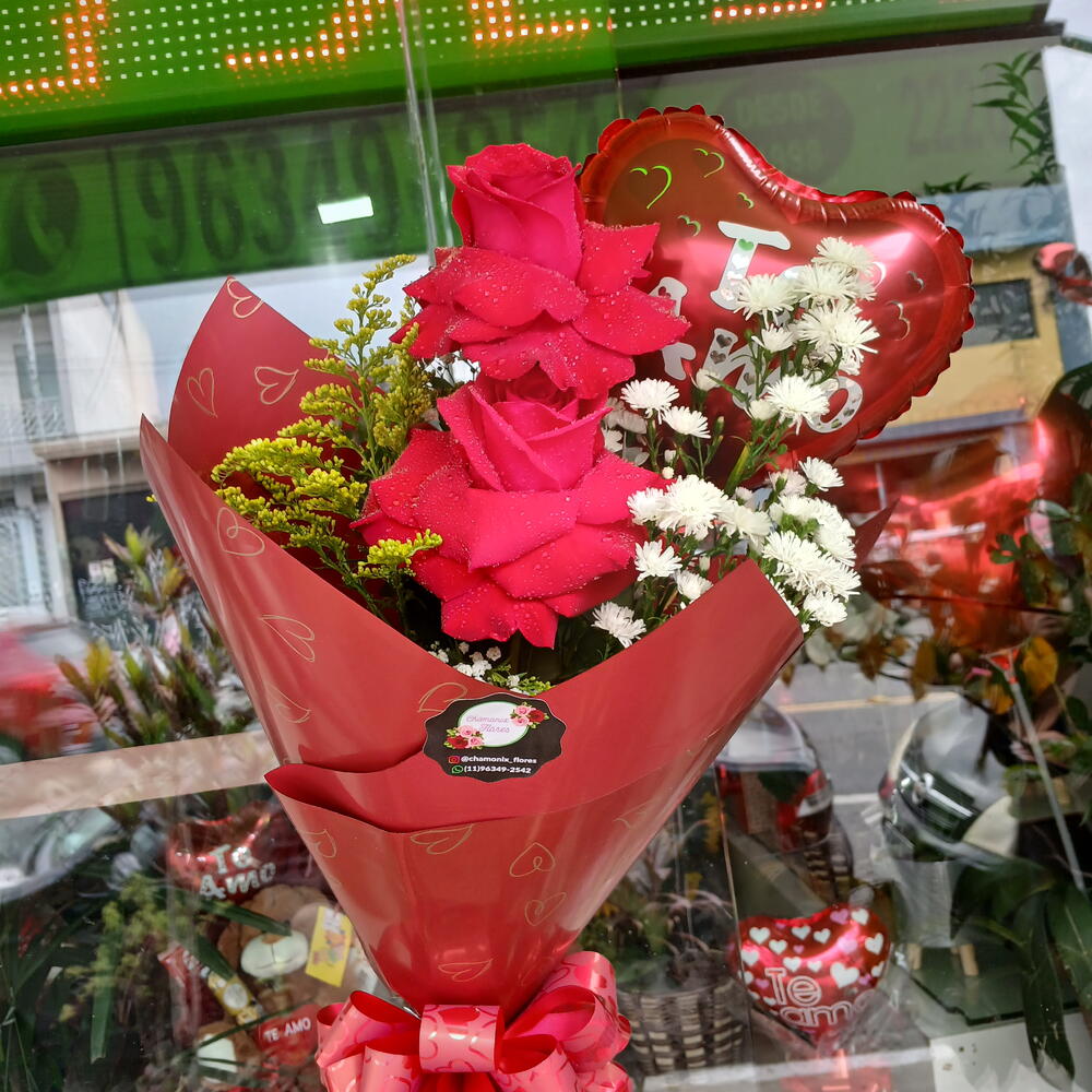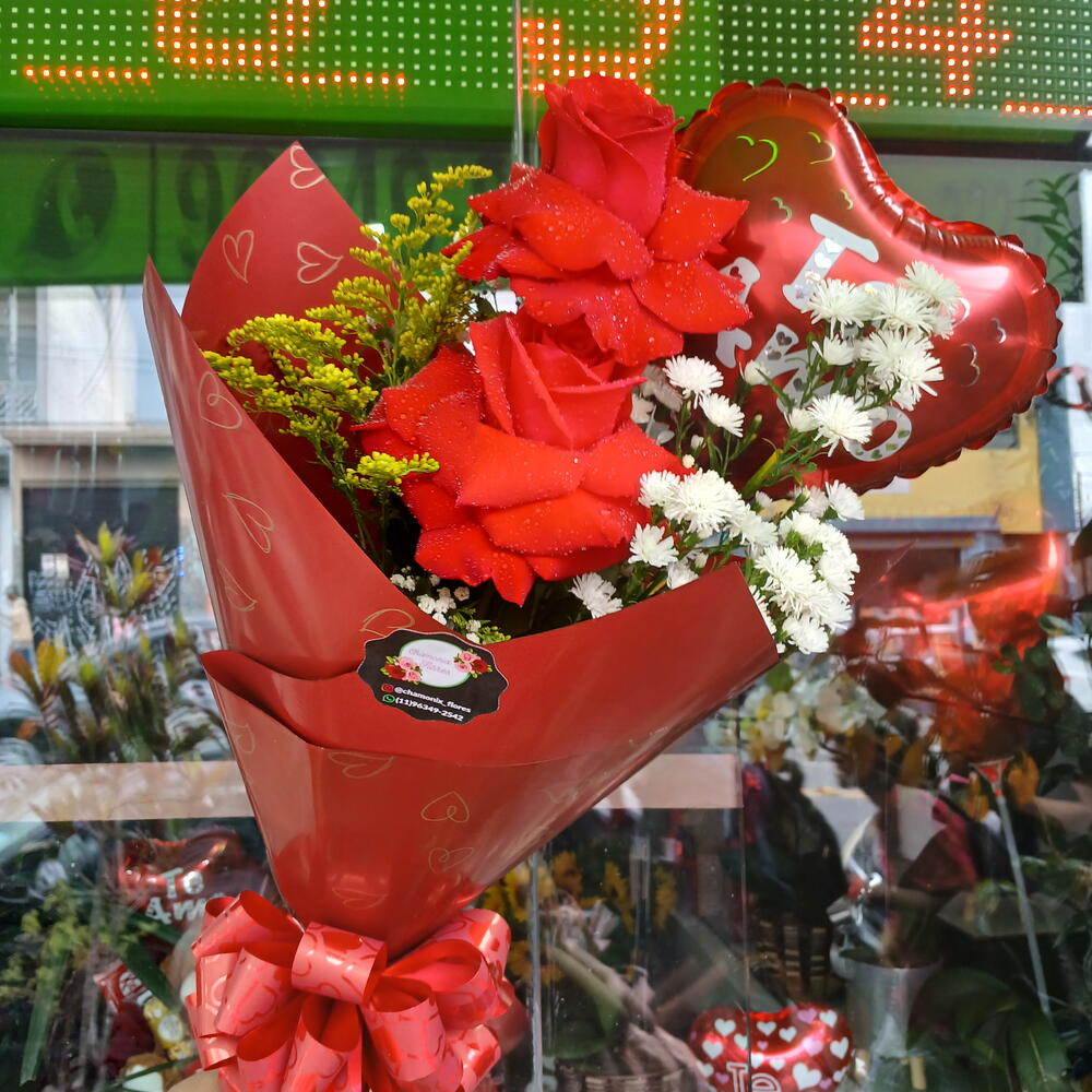 tango - 1 un. folhagem - 2 un. laço - 1 un. balão em formato de coração - 1 un. rosa importada - 2 un. egypsofila - 1 un.