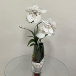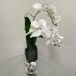 Este elegante arranjo de flores é composto por uma lindíssima orquídea branca permanente, habilmente posicionada entre seletas pedras decorativas. A sua beleza é ainda mais acentuada pelo sofisticado vaso de vidro incluído. Ideal para adicionar um toque de classe e elegância a qualquer ambiente.