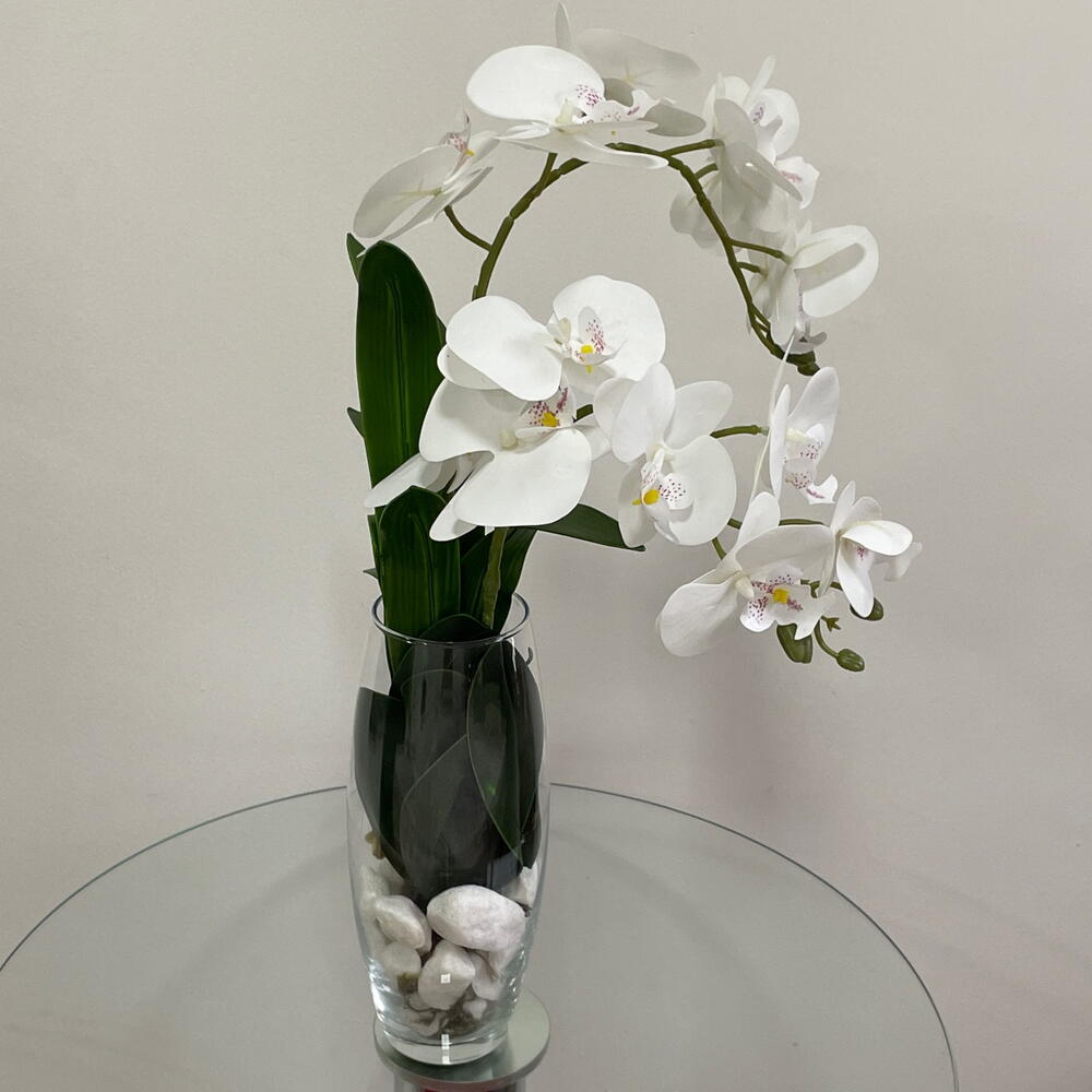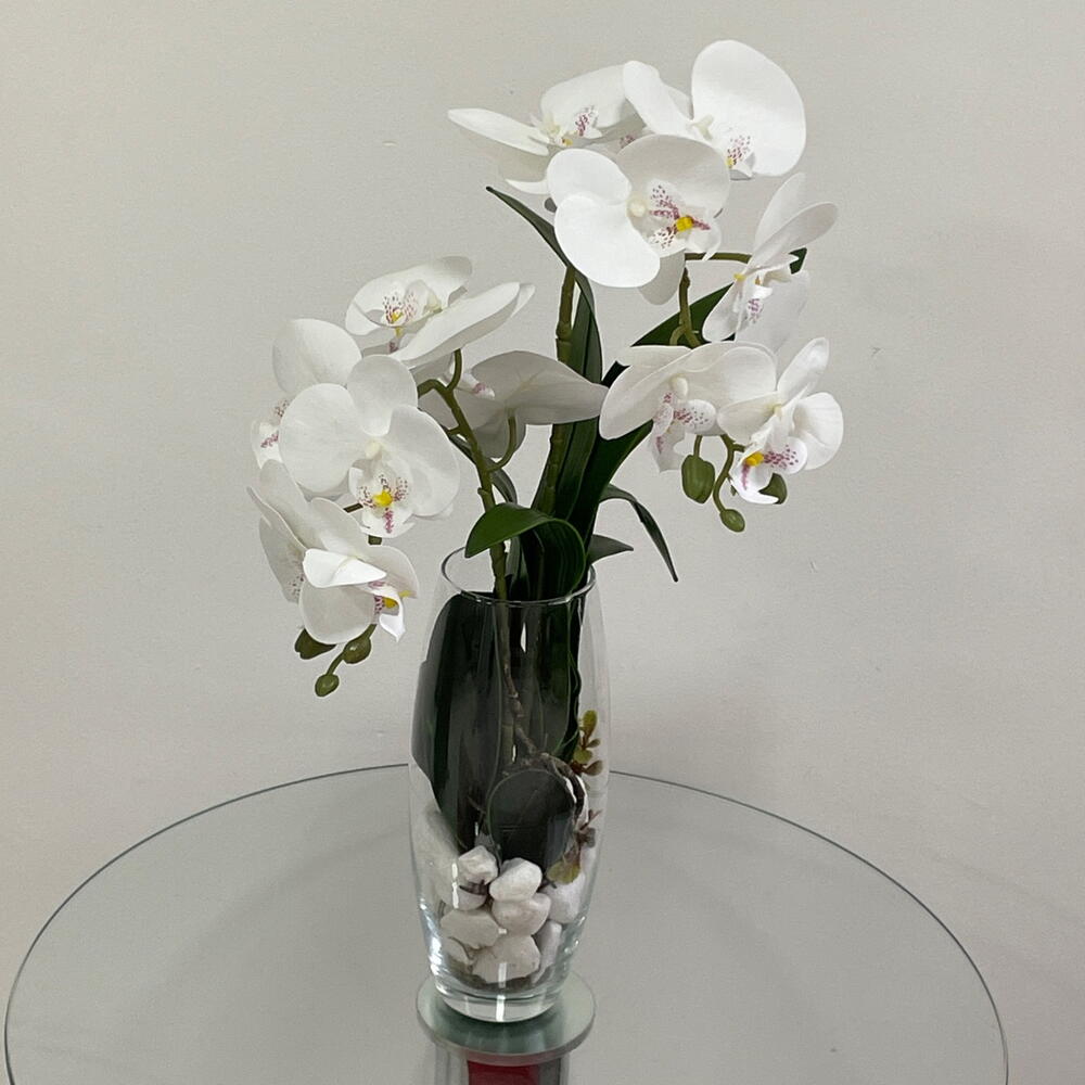 vaso de vidro - 1 un. arranjo de pedras com orquídea branca permanente - 1 un.