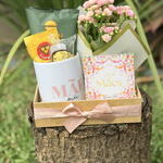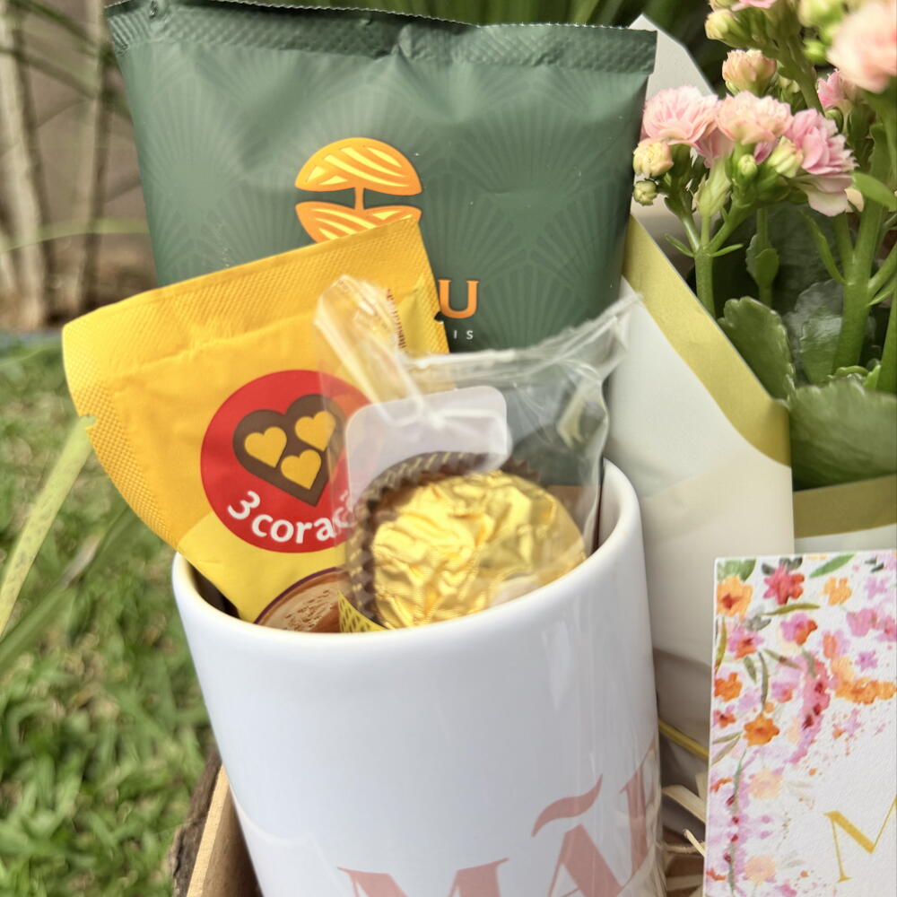 caneca dia das mães - 1 un. caixa mdf - 1 un. drip coffee orfeu - 1 un. ferrero rocher (3 unidades) - 1 un. calandiva de vaso - 1 un. cartão dia das mães - 1 un. capuccino sachê três corações - 1 un. laço personalizado (cesta) - 1 un.
