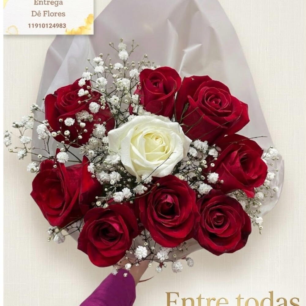 Este bouquet é uma declaração de amor em sua forma mais pura. Composto por nove rosas vermelhas intensas, cada pétala carrega consigo a paixão e o desejo, enquanto a rosa branca centraliza a composição, representando a pureza e a singularidade do sentimento. As rosas estão cuidadosamente adornadas com gotas de orvalho que refletem delicadeza e frescor, destacando a beleza natural das flores. A combinação do vermelho profundo com o branco suave cria um contraste harmonioso, perfeito para momentos especiais, como declarações de amor, aniversários de relacionamento ou celebrações românticas. Um presente que diz mais do que palavras, simbolizando o sentimento de “entre todas elas, escolhi você”.