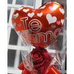 celofane transparente - 1 un. caixa de ferrero rocher - 8 un. balão coração te amo - 1 un. laço personalizado - 1 un. bilhete impresso + envelope - 1 un. rosa vermelha artificial perfumada - 1 un.