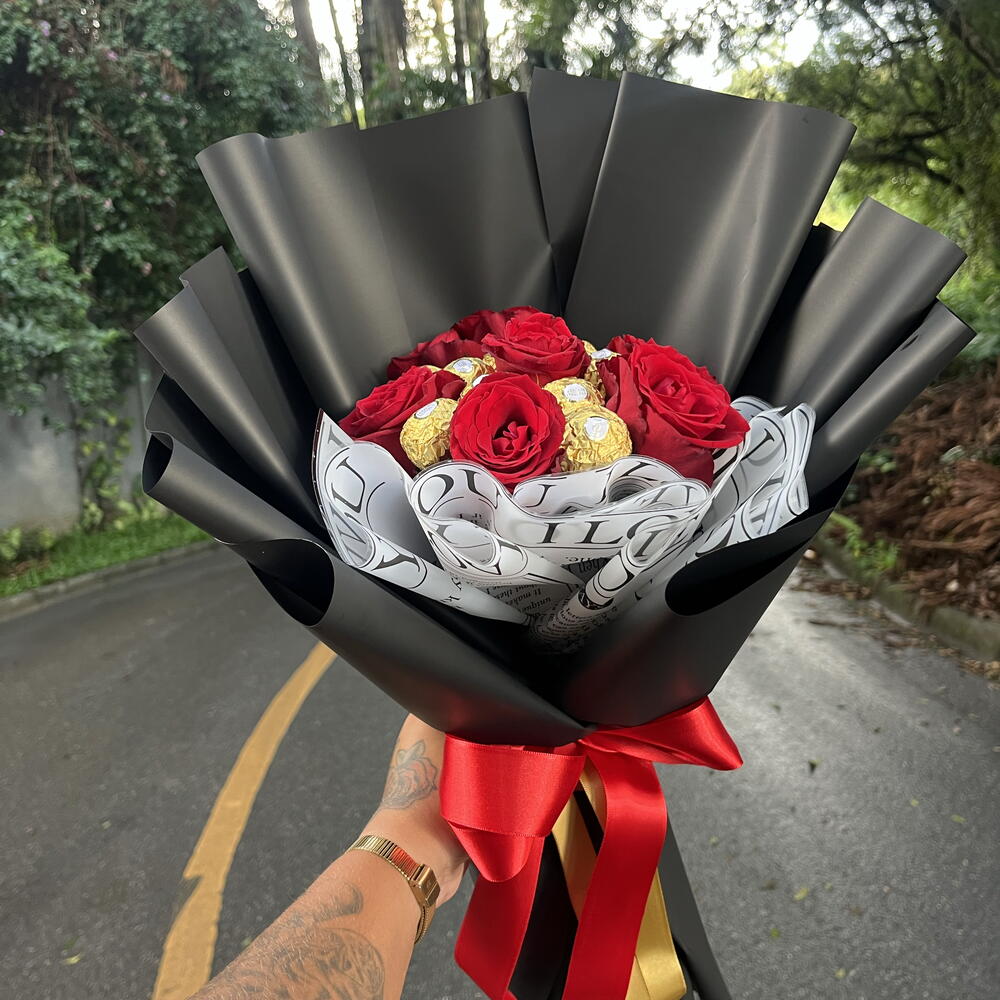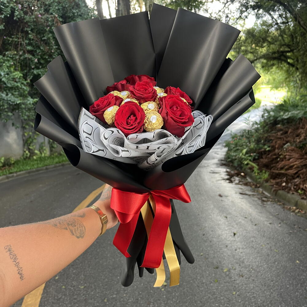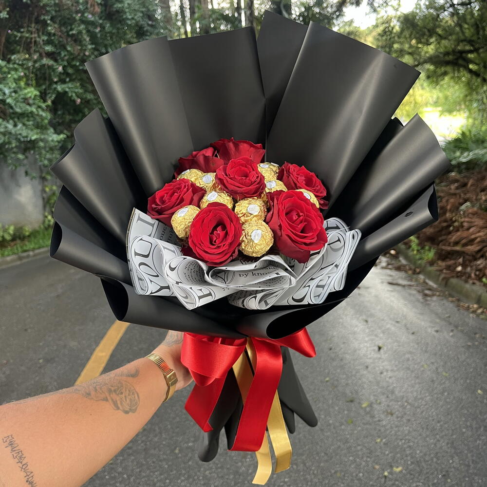 Presenteie alguém especial com esta caixa elegante, que combina o romantismo de 7 rosas naturais e a indulgência de 12 chocolates Ferrero Rocher. Embalado com cuidado e finalizado com um laço charmoso, este presente é perfeito para qualquer ocasião, sendo a expressão perfeita de carinho e apreciação.