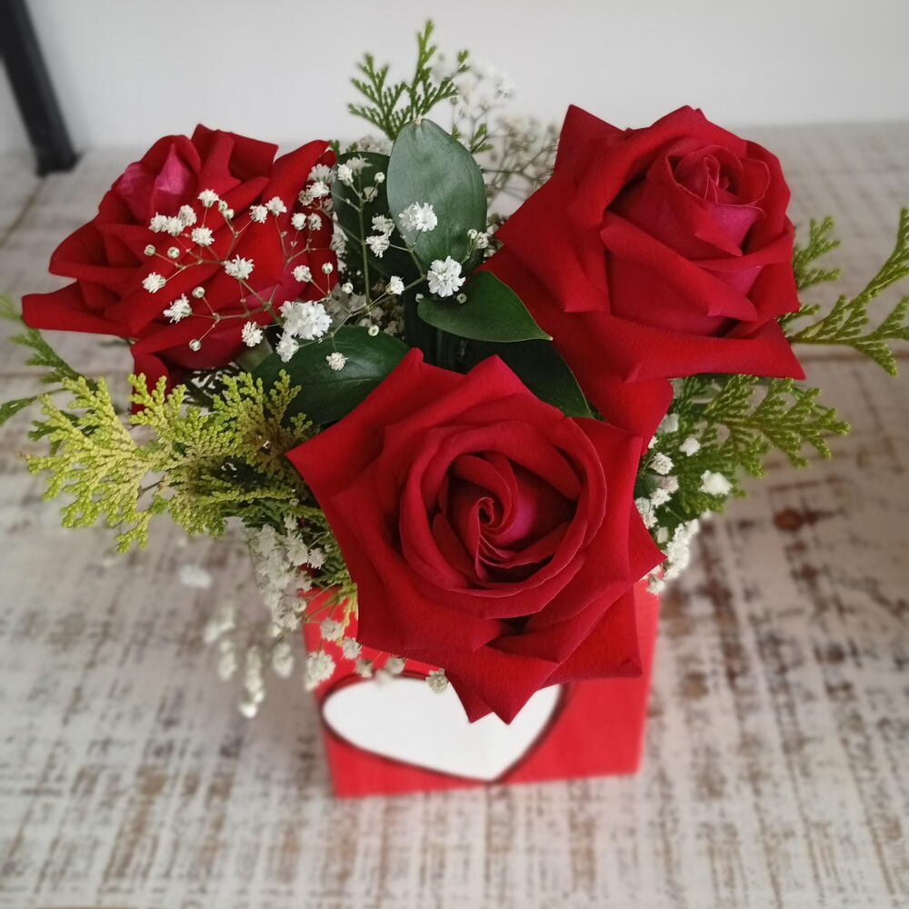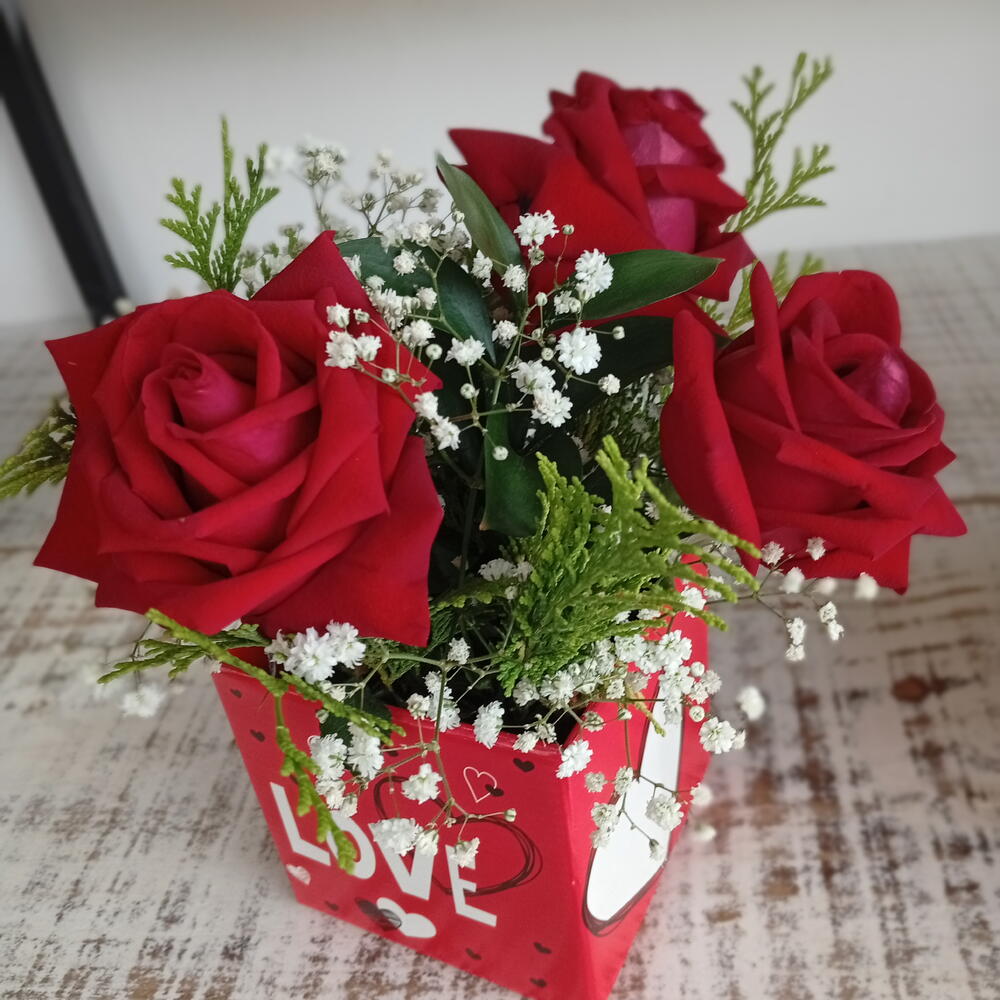 mosquitinhos - 1 un. box (caixa) - 1 un. tuia - 2 un. rosa importada colombiana - 3 un.