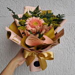 Composição delicada com 1 Gerbera fresca, flores mistas e folhagens selecionadas. Embrulho em folhas de poli (cor escolhida pela florista, conforme disponibilidade) e finalização com laço de cetim. As flores são naturais e podem apresentar pequenas variações de tonalidade e formato, preservando sempre a harmonia e a qualidade do arranjo.