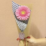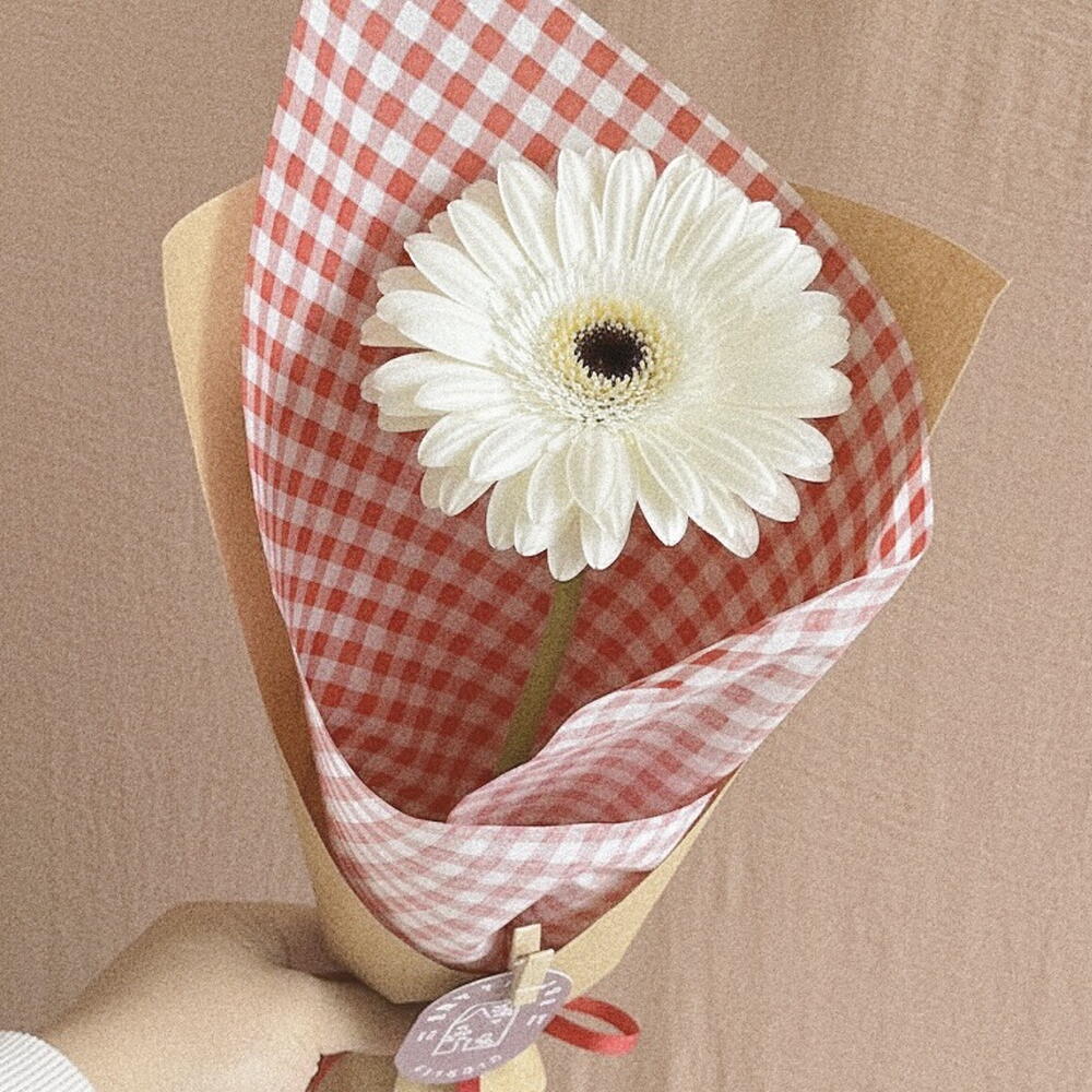 papel kraft - 1 un. laço em cetim - 1 un. papel de seda quadriculada variada - 1 un. gérbera variada do dia - 1 un.