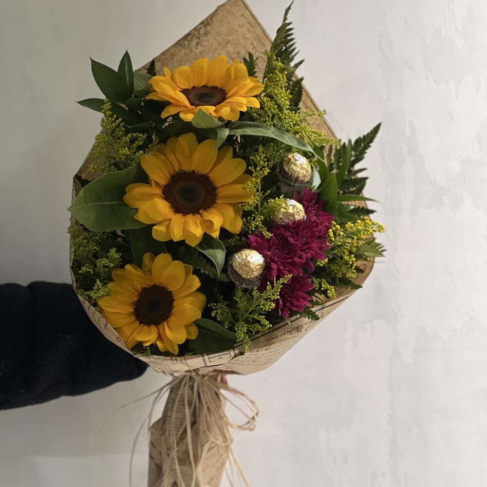 Envolva alguém especial com esse presente irresistível. O Presente com Chocolate inclui três adoráveis Girassóis, fazendo par perfeito com três sofisticados chocolates Ferrero Rocher e três doces Tangos para agradar seu paladar. Este conjunto exclusivo também apresenta finos verdes de complementos para enriquecer ainda mais a sua experiência. Tudo isso lindamente embalado, pronto para surpreender quem você ama. Um delicado gesto de afeto, uma doce forma de dizer Eu te amo, Feliz Aniversário ou apenas Tenha um dia maravilhoso.
