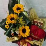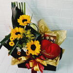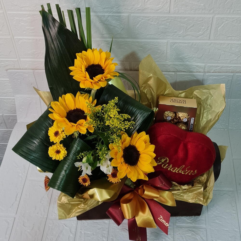 Este presente especial combina a doçura do chocolate com o calor da pelúcia. Contém um adorável girassol em quantidade de três unidades, um peluche em formato de coração que aquece qualquer pessoa, uma caixa de chocolates Ferrero Rocher com oito unidades para adoçar o paladar, e tudo envolvido por um lindo laço que acrescenta um toque de elegância. Tudo é embalado com carinho numa caixa graciosa que serve de belo recipiente para este presente magnífico. Uma escolha perfeita para expressar seu carinho a alguém especial!