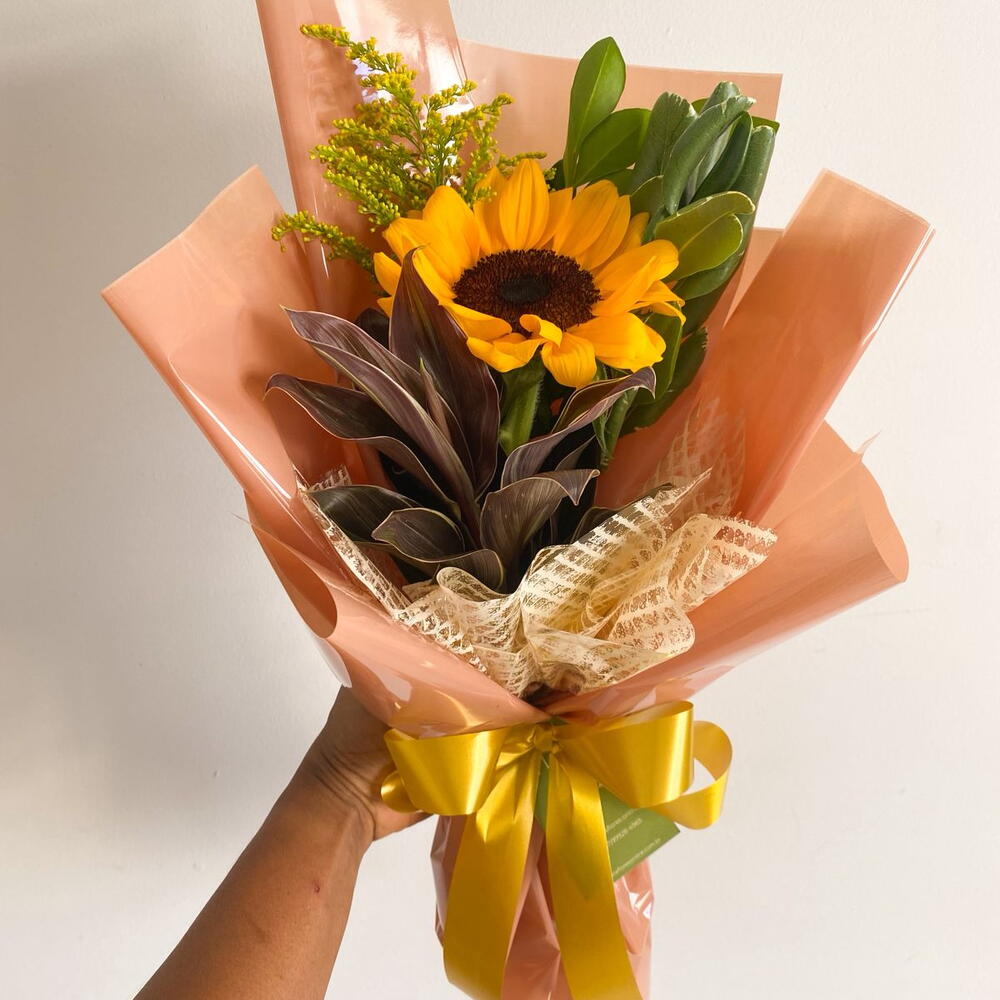 Este charmoso arranjo de flores é composto por um girassol radiante, cercado por folhagens frescas e complementos que adicionam um toque de sofisticação. Toda essa beleza é cuidadosamente embalada, complementada com um elegante laço, tornando-se uma opção perfeita para presentear ou decorar qualquer ambiente com delicadeza e elegância.