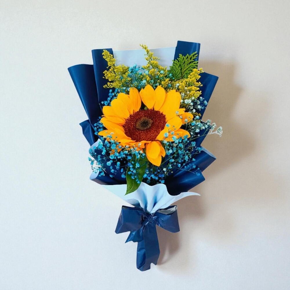 Este buquê deslumbrante apresenta uma peça central de girassol, complementada por uma unidade de folhagem. A embalagem de design exclusivo e o laço graciosamente amarrado adicionam um toque final de sofisticação. Ideal para presentear alguém especial ou decorar o seu espaço, este buquê irá definitivamente iluminar o seu dia.