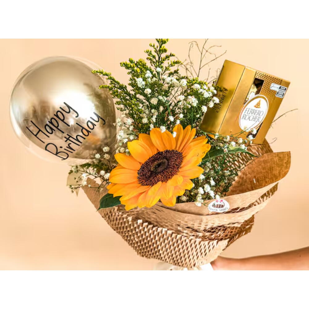Este kit de presente é a combinação perfeita de alegria e doçura. Ele contém um lindo girassol, simbolizando felicidade e calor, e um balão Bubble de 20cm com a mensagem Happy Birthday, trazendo uma vibração de festa. Além disso, a oferta fica ainda mais saborosa com uma unidade de Chocolate Ferrero Rocher de 50g. Completam o kit delicadas folhagens e complementos, tudo embalado de forma elegante com um laço. Um presente pensado para encantar e celebrar momentos especiais.