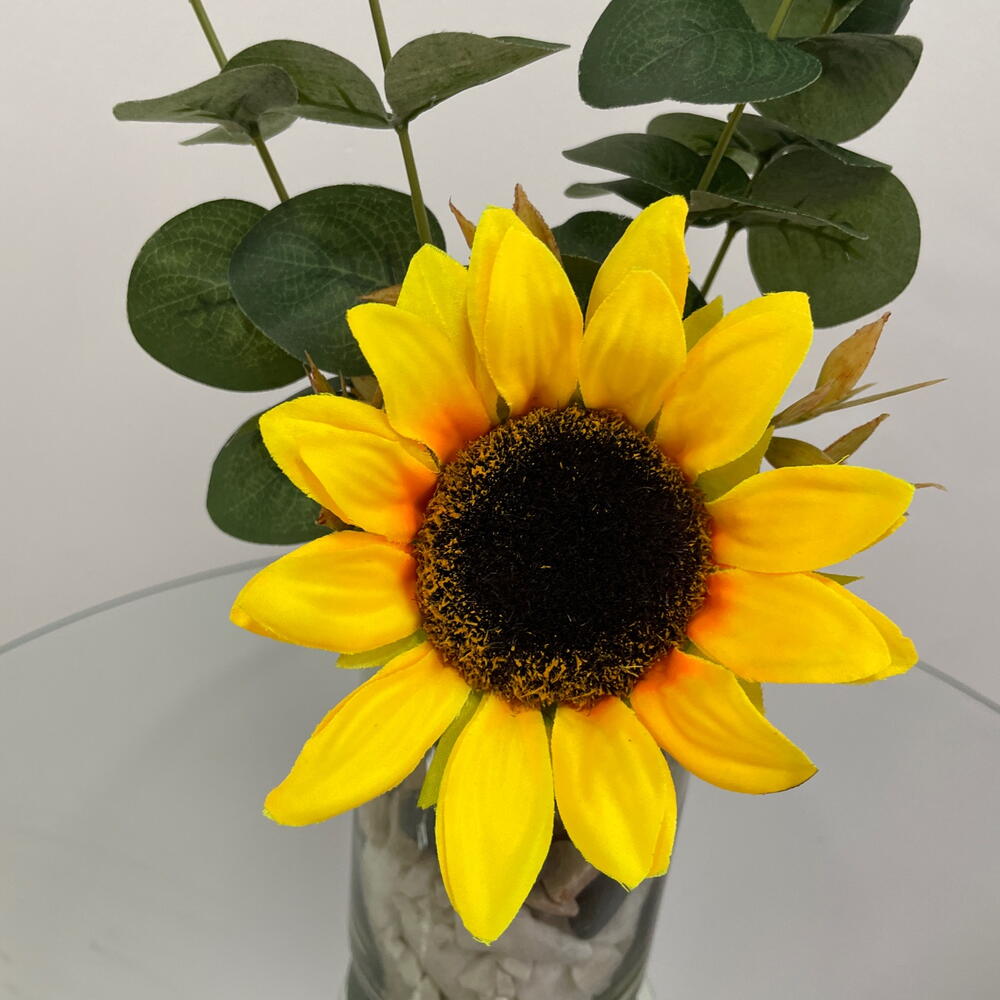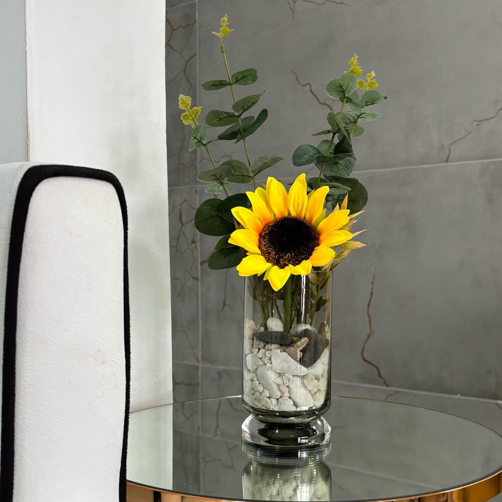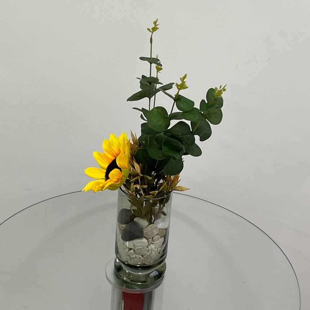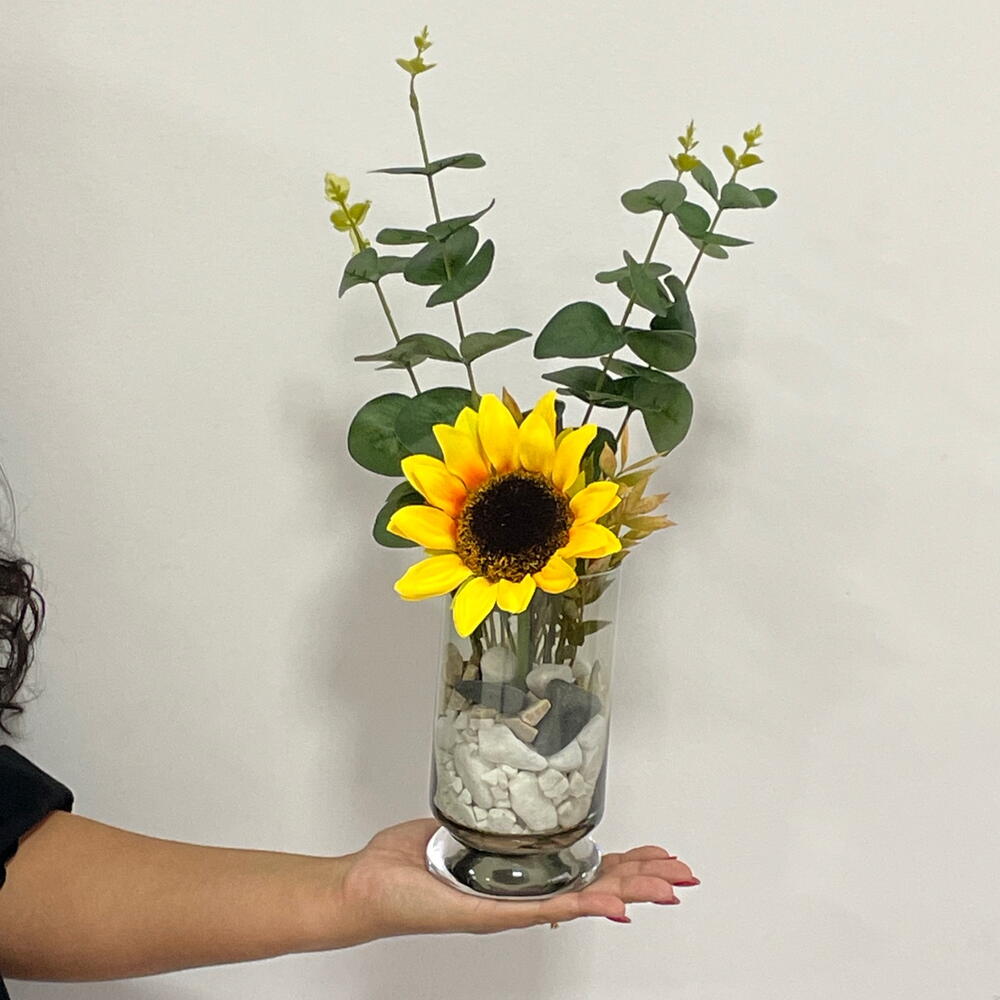 vaso de vidro - 1 un. girassol permanente - 1 un. arranjo com pedras - 1 un.