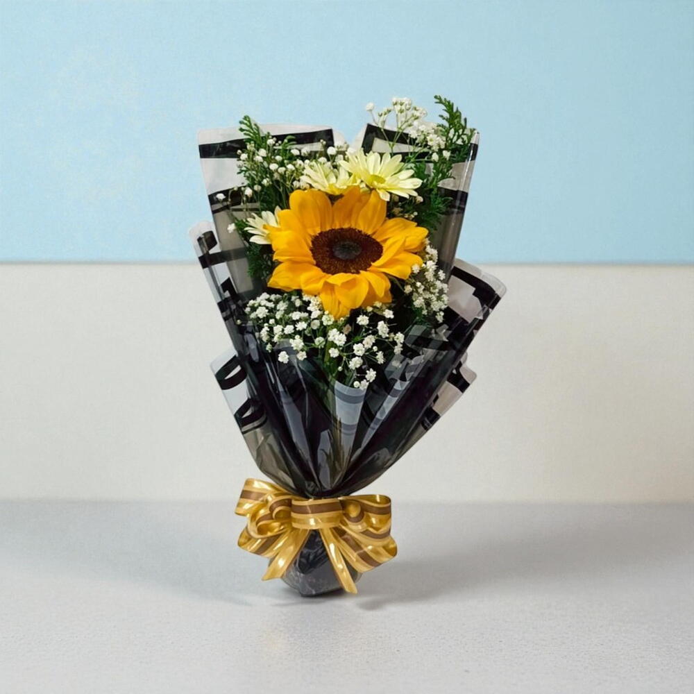 Encante-se com este deslumbrante buquê, composto por uma unidade de girassol vibrante, complementada por uma folhagem elegante. Cada buquê é meticulosamente embalado em uma designer embalagem e finalizado com um laço sofisticado. Um buquê que não só expressa sentimentos, mas também é um deleite para os olhos.