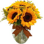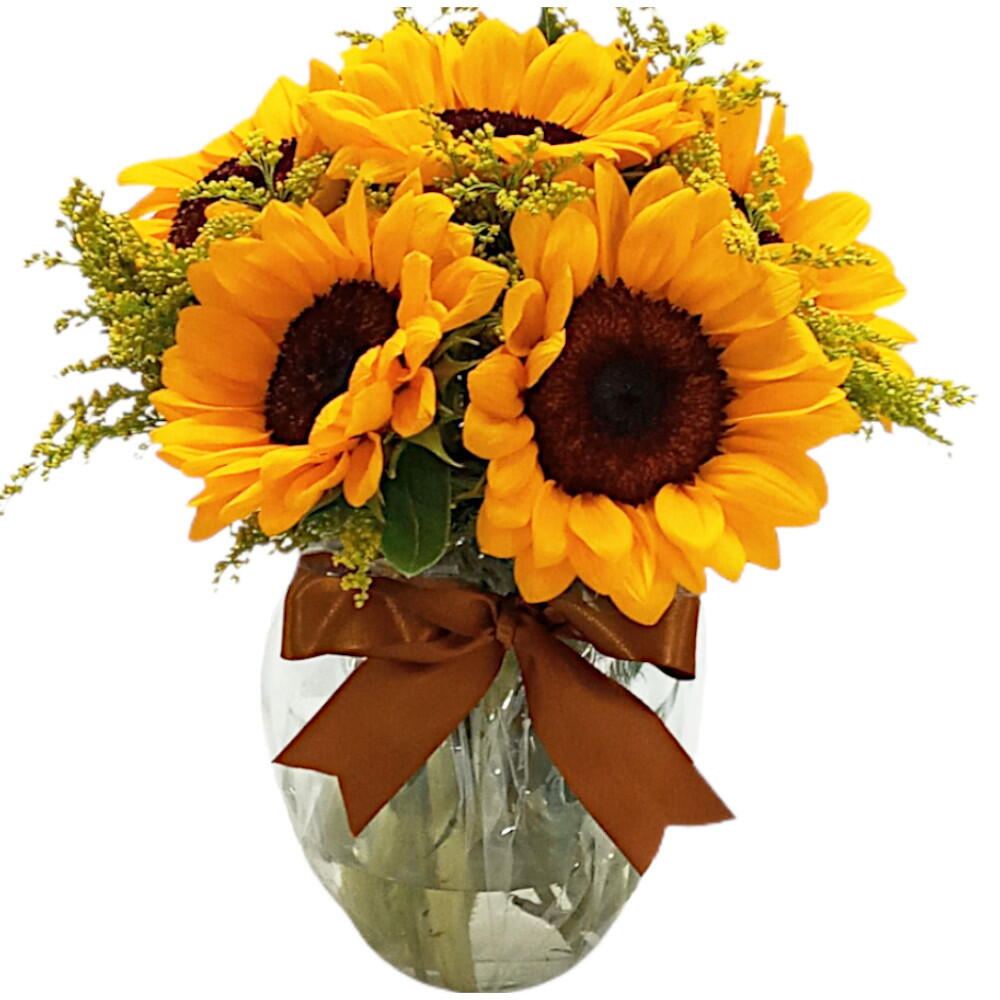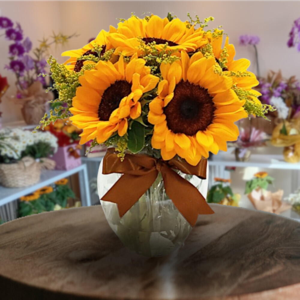Emanando alegria e vivacidade, este arranjo de flores em vaso apresenta seis belos galhos de girassol, cada um exalando um charme e frescor inigualáveis. Completando a apresentação, o arranjo é perfeitamente acomodado em um vaso de vidro de formato pera de tamanho médio, ampliando sua elegância e delicadeza. Ideal para decorar qualquer espaço, este produto é um verdadeiro emblema de beleza natural e esplendor.