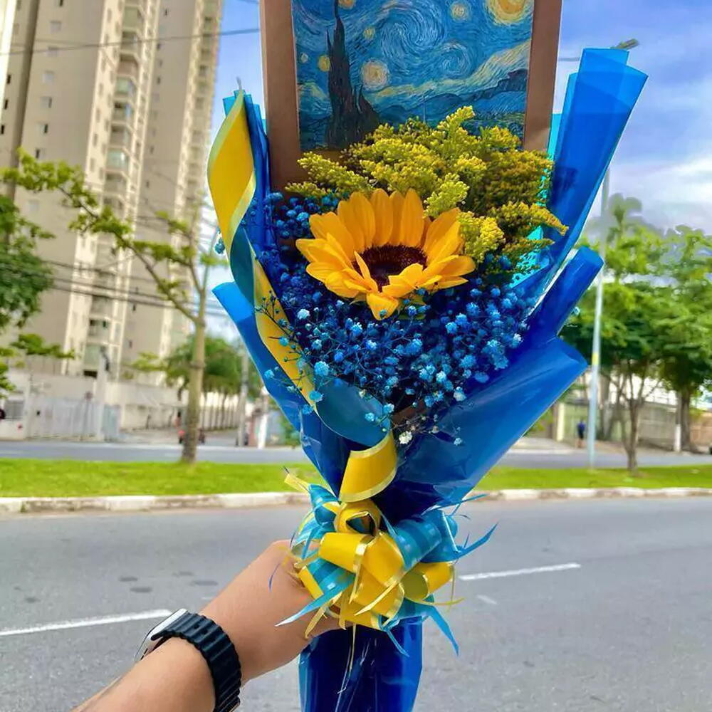 girassol - 1 un. folhagens frescas nas cores azul e amarela - 1 un. embalagem delicada em celofane - 1 un.