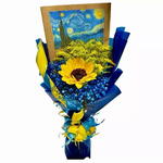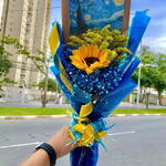Este buquê esbanja brilho e alegria repleto de girassol, folhagens frescas nas tonalidades azul e amarela. O conjunto é elegantemente adornado com uma delicada embalagem em celofane, dando um toque de sofisticação. Ideal para transmitir positividade e encanto em todas as ocasiões.