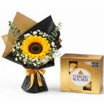 Um presente elegante e cheio de significado. O Girassol Premium simboliza alegria, admiração e energia positiva. Neste lindo buquê, ele vem acompanhado de delicadas flores brancas e uma embalagem sofisticada em preto e dourado, junto com Ferrero Rocher,4 unidades, um dos chocolates mais apreciados do mundo.
