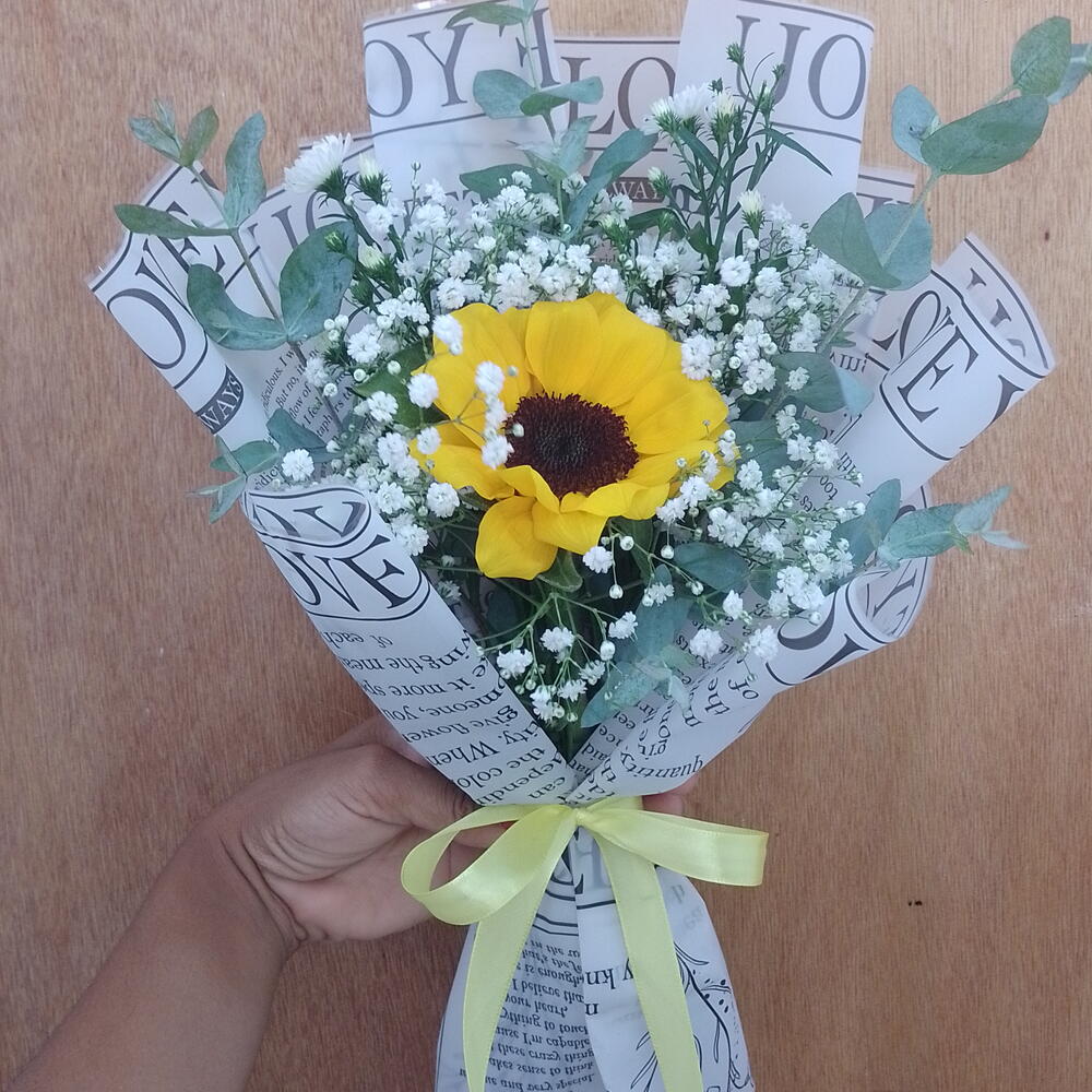 embalagem - 1 un. girassol - 1 un. laço - 1 un. folhagem verde e gipsofila - 3 un.