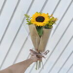 Buquê vibrante e radiante, composto por 3 unidades de tango exótico, 1 unidade de girassol solar e 1 unidade de astromelia espetacular. Perfeito para alegrar o dia de alguém ou decorar qualquer espaço, trazendo um toque de natureza e frescor.