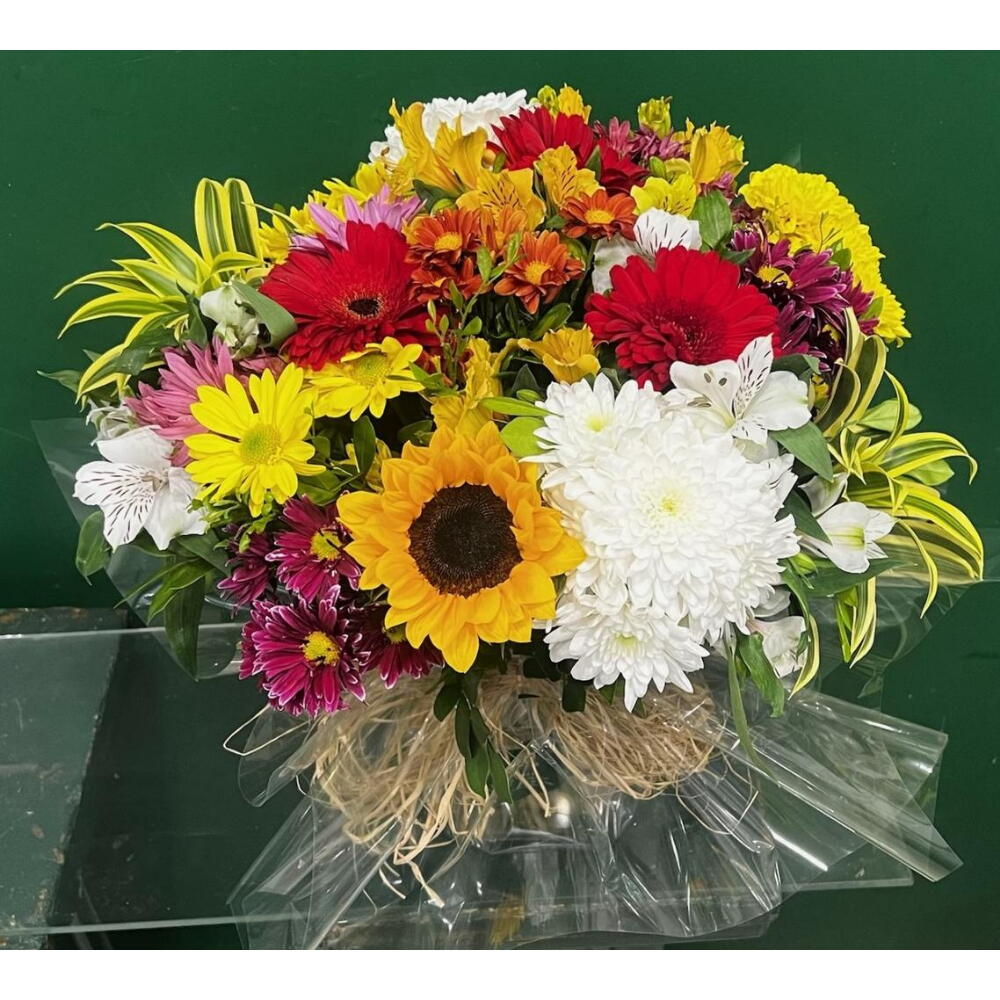 girassol - 1 un. gérbera - 1 un. margaridas - 1 un. folhagem verde - 1 un. astromelias - 1 un. jarra de vidro - 1 un. monsenhor - 1 un.