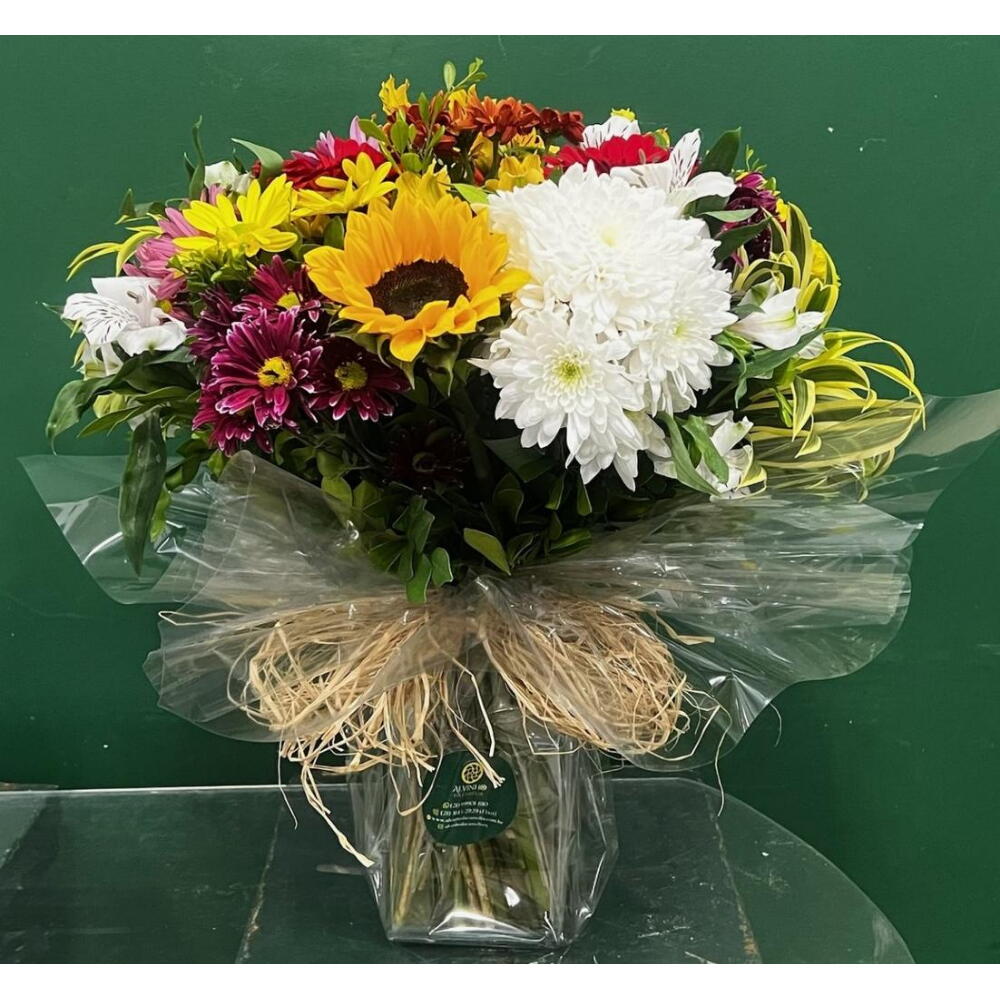 Encante-se com a vibrante combinação deste arranjo floral, composto por 1 unidade de gérbera, 1 unidade de girassol, 1 unidade de monsenhor, 1 unidade de margaridas e 1 unidade de astromélias. Complementando a beleza das flores, incluímos 1 unidade de folhagem verde para adicionar um toque de contraste e frescor. Toda esta maravilha está cuidadosamente disposta em uma elegante jarra de vidro, perfeita para decorar qualquer ambiente com um toque de natureza e sofisticação.