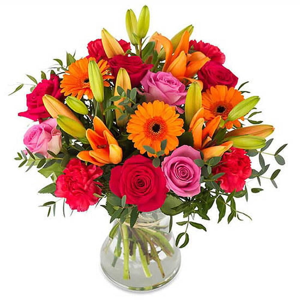 Surpreenda com este encantador vaso de flores! Com uma composição delicada de 3 hastes de lírios laranja, realçada por 5 gérberas vibrantes da mesma cor. Adicionamos ainda um toque romântico com 6 rosas cor de rosa e a paixão de 6 rosas vermelhas. Tudo apresentado em um elegante jarro de vidro que adiciona um toque extra de sofisticação. Perfeito para qualquer ocasião, este arranjo floral com certeza trará um sorriso ao rosto de quem o receber.
