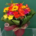 Encante seus sentidos com essa deslumbrante combinação de flores em vaso. Uma seleção única de 5 girassóis majestosos, acompanhados por uma harmonia de 6 rosas em tons vibrantes de laranja e amarelo, além de 6 delicadas rosas em suave tom rosa. O encanto final vem de uma elegante folhagem de canoa que engloba o conjunto, dando um toque final de esplendor. Ideal para presentear um ente querido ou apenas para enfeitar sua casa com uma pitada de natureza e cor.