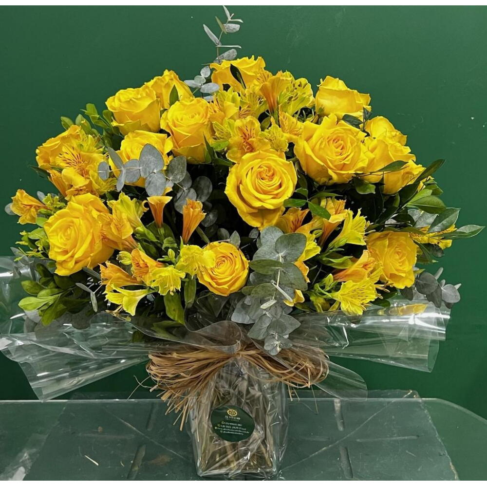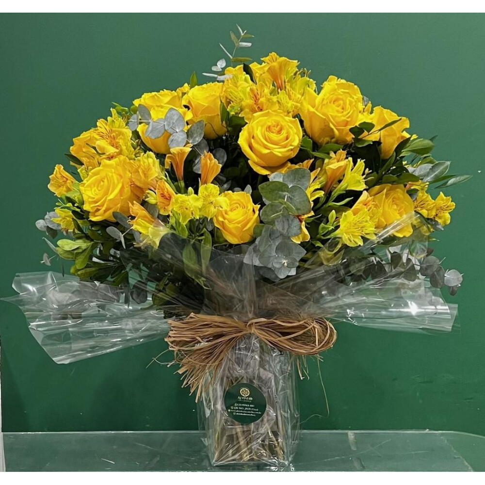 vaso - 1 un. folhagem verde - 1 un. astroméria amarelas - 1 un. rosa amarelas nacionais - 18 un.