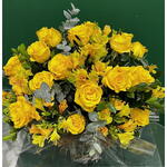 Este encantador buquê, composto por 18 rosas amarelas nacionais cuidadosamente selecionadas, é complementado por uma magnífica astromélia amarela e folhagem verde fresca. Todos esses tesouros da natureza são apresentados em um elegante vaso incluído. Esta combinação brilhante é perfeita para iluminar o dia de alguém!