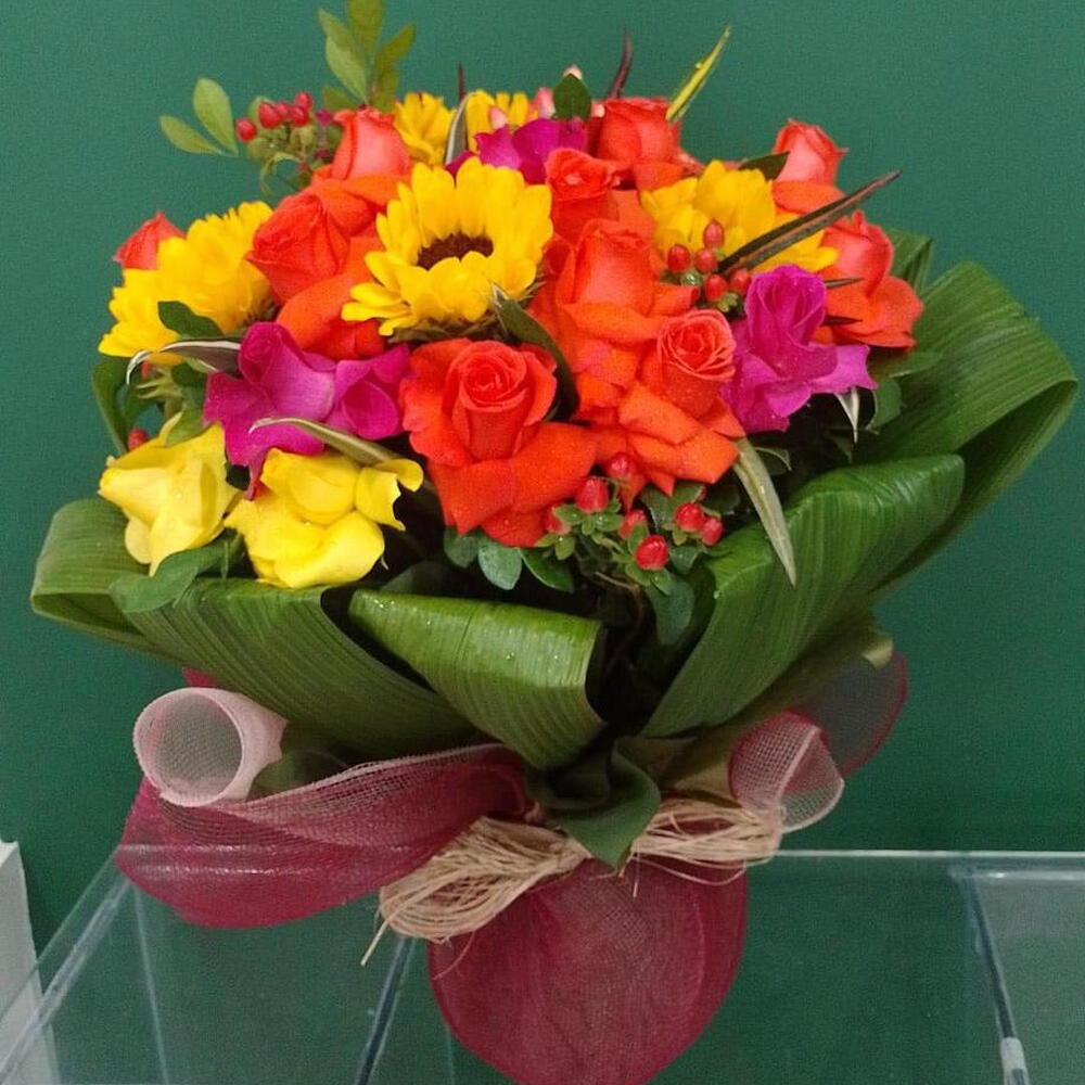 girassol - 5 un. rosa amarelas - 6 un. rosa laranjas - 6 un. rosa rosa - 6 un. folhagem de canoa em volta - 1 un.