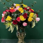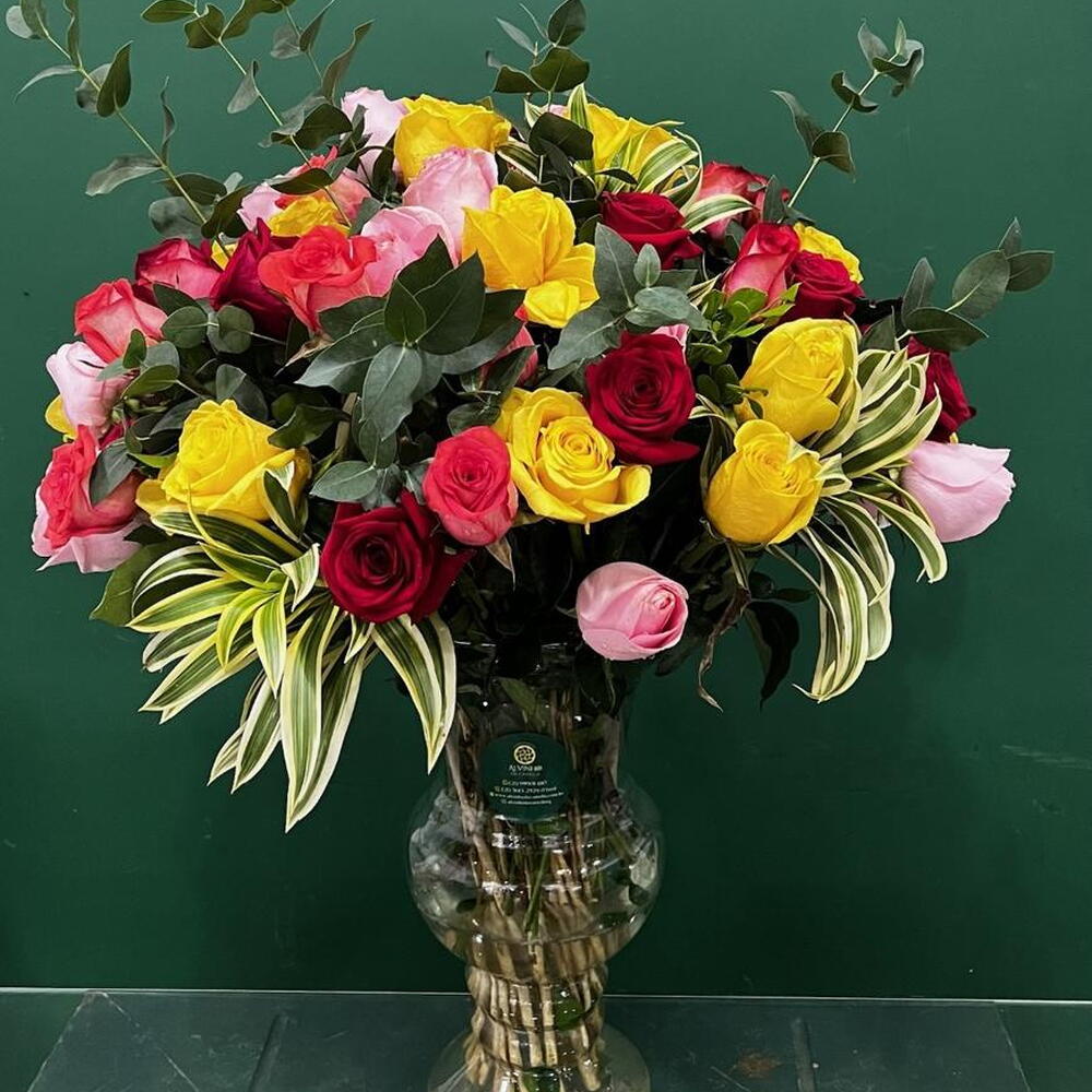 Descubra a vibrante beleza deste arranjo floral composto por 40 rosas vivamente coloridas em tons de rosa, vermelho, amarelo e laranja, cuidadosamente selecionadas e organizadas. Complementado com uma unidade de folhagem verde, este bouquet alegre é apresentado em um vaso charmoso, tornando-o um presente perfeito ou um elemento decorativo elegante para qualquer ambiente. Transforme seu espaço ou expresse seus sentimentos com este deslumbrante espetáculo de cor e vida.