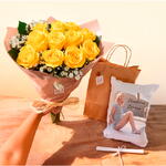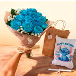rosa - 1 un. lilás - 1 un. amarela - 1 un. foto ou frase - 1 un. almofada (30x20cm) personalizada com nome - 1 un. buquê floral com 12 rosa naturais — escolha a cor: azul - 1 un. cor de rosa - 1 un. chá ou lady - 1 un.