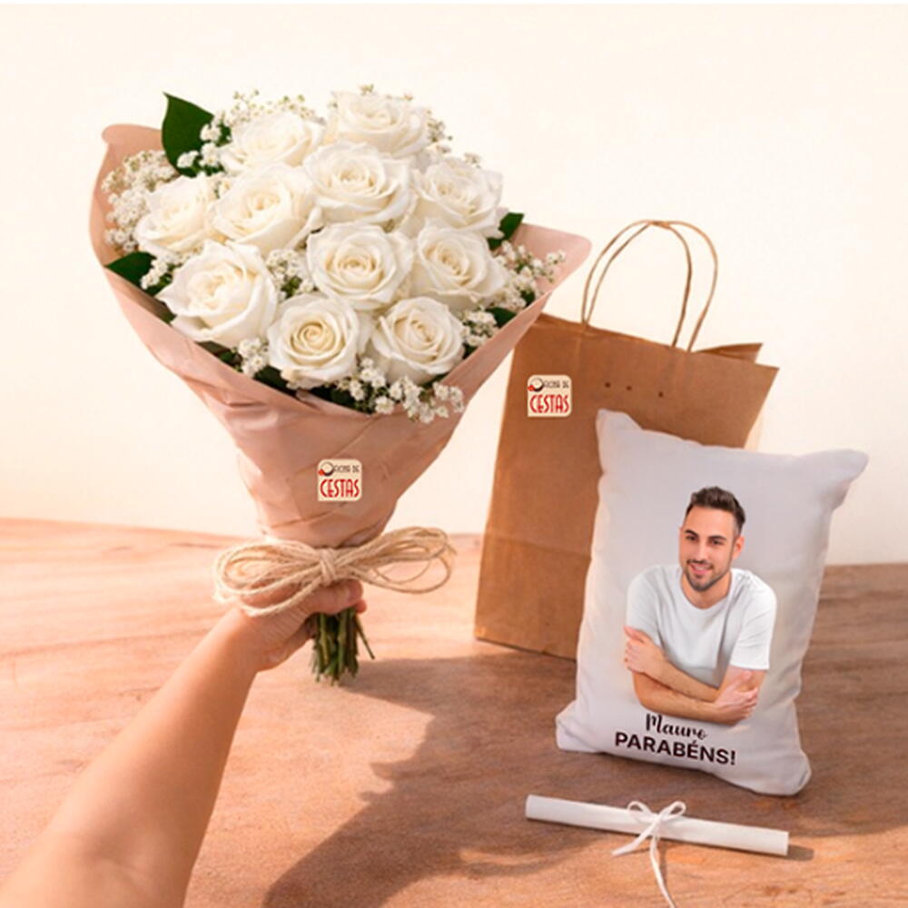 rosa - 1 un. lilás - 1 un. amarela - 1 un. foto ou frase - 1 un. almofada (30x20cm) personalizada com nome - 1 un. buquê floral com 12 rosa naturais — escolha a cor: azul - 1 un. cor de rosa - 1 un. chá ou lady - 1 un.