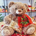 Este kit de presente é uma elegante combinação de elementos selecionados com o maior cuidado. O centro do kit é formado por um delicioso Ferrero Rocher de 150g, encantadoramente agridoce e de textura única. Acompanha um mimo fofo, uma pelúcia de alta qualidade, para trazer um toque de ternura e romantismo. Além disso, o kit é adornado com seis rosas exuberantes e delicadas folhagens, criando uma apresentação encantadora. E tudo isto envolto em uma bela embalagem e arrematado por um elegante laço, tornando-o o presente perfeito para agradar alguém especial.