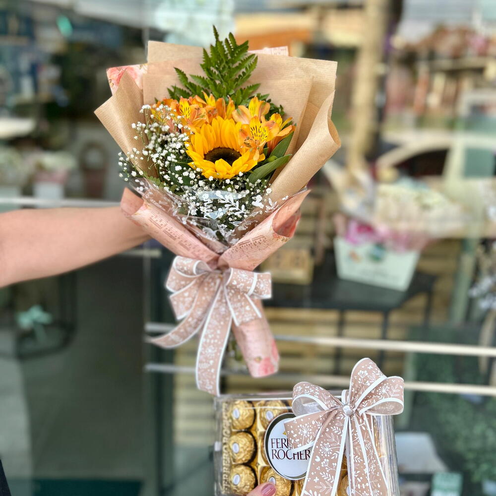 astromélia - 2 un. girassol - 1 un. ferrero rocher - 12 un. laço - 2 un.