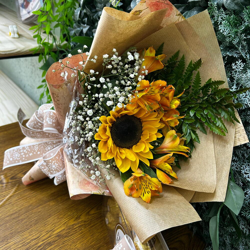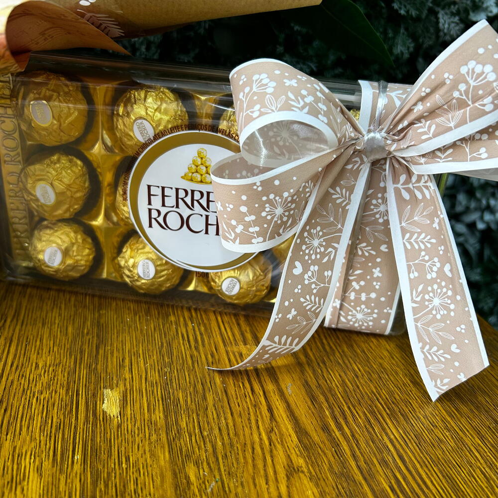 Este presente encantador conta com dois arranjos de astromélias, um poderoso girassol e uma deliciosa e indulgente caixa com doze unidades de Ferrero Rocher. Para completar, apresenta dois laços delicados, combinando beleza e doçura num único presente. Ideal para bodas, aniversários, ou simples ocasiões especiais, esta mistura de flores e chocolates certamente agradará os seus entes queridos.