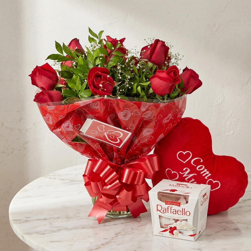 buquê de rosa vermelhas - 12 un. rafaello ( caixa de bombons com 9 unidades) - 1 un. coração de pelúcia vermelho com frase - 1 un.