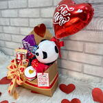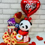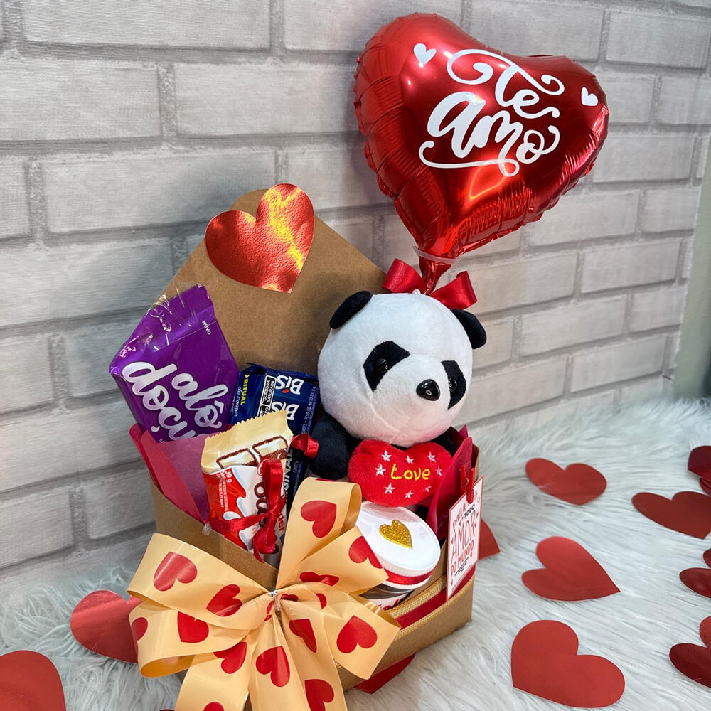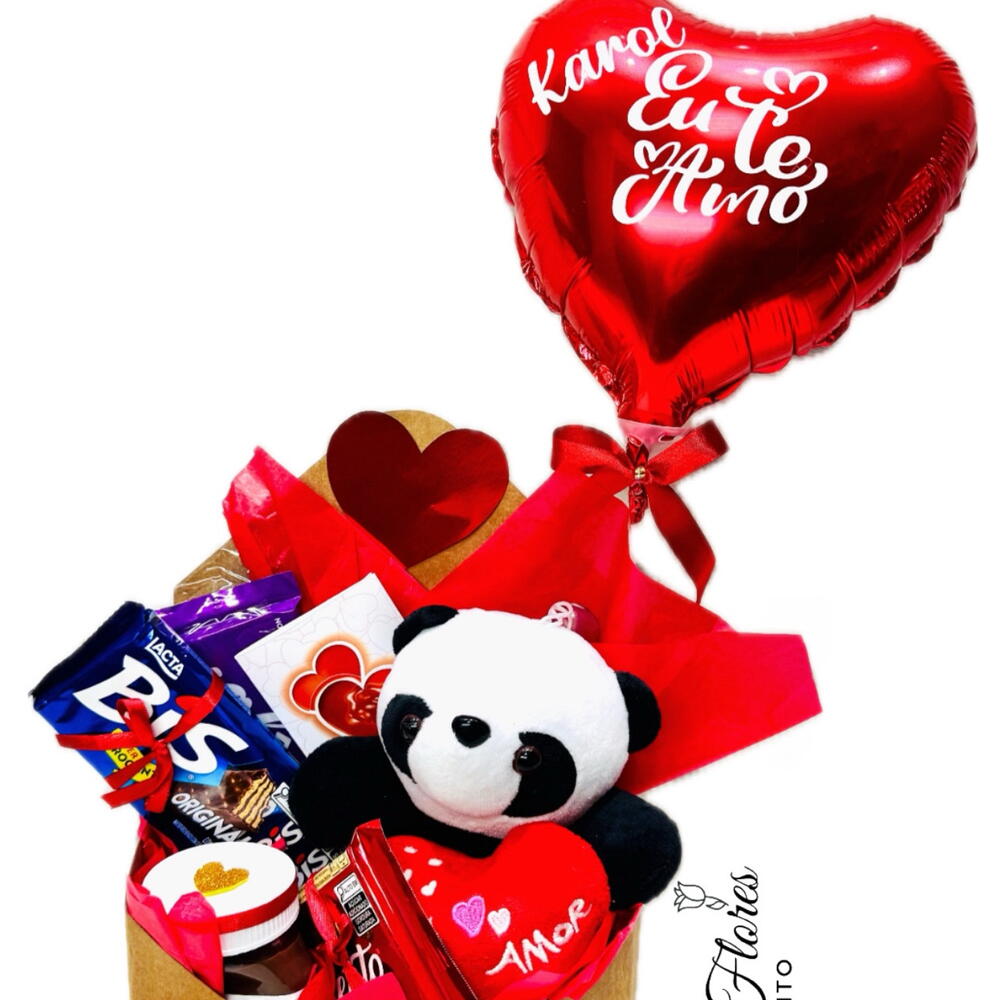 Este lindo presente é perfeito para os amantes de chocolate. O pacote é composto por uma barra de chocolate gourmet, 1 unidade de deliciosa Nutella, 1 generoso pack de Bis Lacta que sempre agrada o paladar, acompanhado de 1 unidade de distintivo Kinder Bueno. Envolto em uma charmosa cesta-envelope com acabamento em celofane e laço, este presente também conta com um fofo urso de pelúcia panda e com um delicado balão de coração de 22 cm. Para completar, um tag e um cartão estão inclusos, permitindo personalizar a sua mensagem de amor e carinho. É o mimo perfeito para qualquer ocasião.