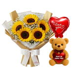 Kit: Buquê de 5 Girassois +Urso Medio Amor da Minha Vida + Balão Eu Te Amo Pra Sempre