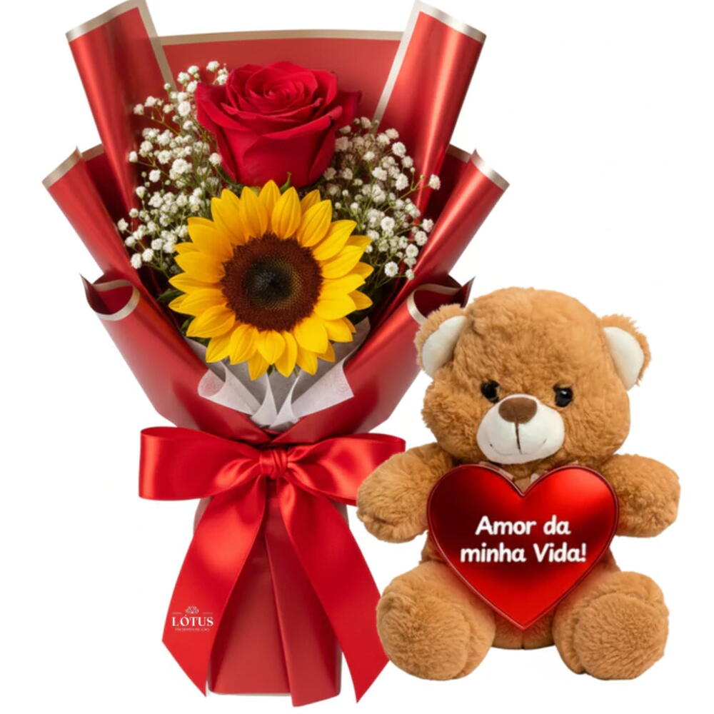 Kit: Buquê Duo com Rosa e Girassol + Urso Medio Amor da Minha Vida