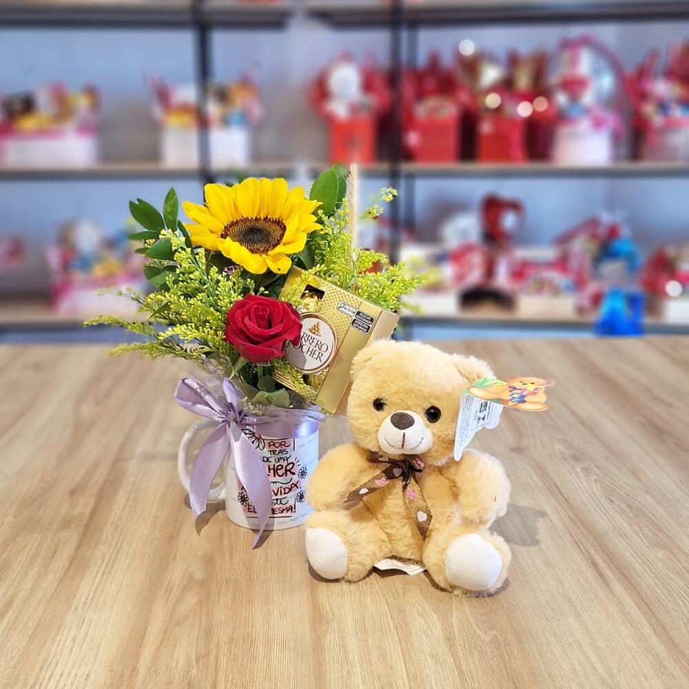 girassol - 1 un. caneca - 1 un. pelúcia 30cm - 1 un. ferrero rocher 50g - 1 un. rosa botão - 1 un.