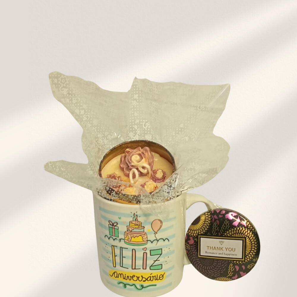 DESCRIÇÃO: KIT CANECA FELIZ ANIVERSARIO E VELA MANDALA O presente perfeito para quem merece brilhar! Surpreenda alguém especial com um presente que une funcionalidade e aconchego. Nosso Kit foi pensado para transformar o café da manhã ou o momento de descanso em uma experiência única e perfumada. O que vem no kit: Caneca Exclusiva 320 ml: Com estampa alegre de Feliz Aniversário, design moderno e cores suaves, perfeita para o café, chá ou chocolate quente. Vela Aromática na Lata: Uma linda lata colecionável com a mensagem Thank You (Obrigado), contendo uma vela artesanal decorada com detalhes que parecem flores reais. Um toque de sofisticação para qualquer ambiente! Apresentação Premium: O kit já vai montado com plástico transparente rendado, balão metalizado em formato de coração e um laço dourado luxuoso. COMPOSIÇÃO: 1 caneca porcelana feliz aniversário 320 ml - 9 cm diâmetro x 10 cm altura 1 Lata vela aromática cera de coco e soja com tampa Thank you EMBALAGEM: Saco de plástico invólucro final Laço dourado